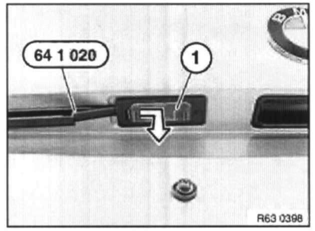 Lever out license plate light (1) with special tool 64 1 020 as illustrated and remove.
