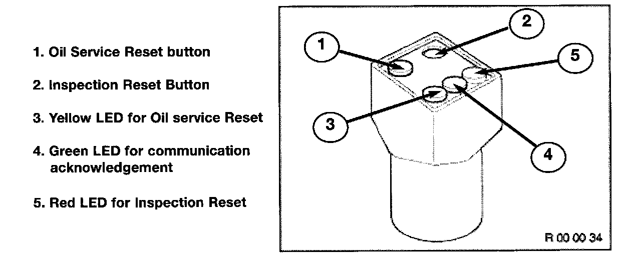 - The reset tool has three LEDs below the reset buttons. The green LED(4) in the center comes on whenever any service reset is selected to indicate that communication is OK. The other two LEDs (3 and 5) indicate that the proper reset (Oil Service: yellow or Inspection: red) is being carried out.