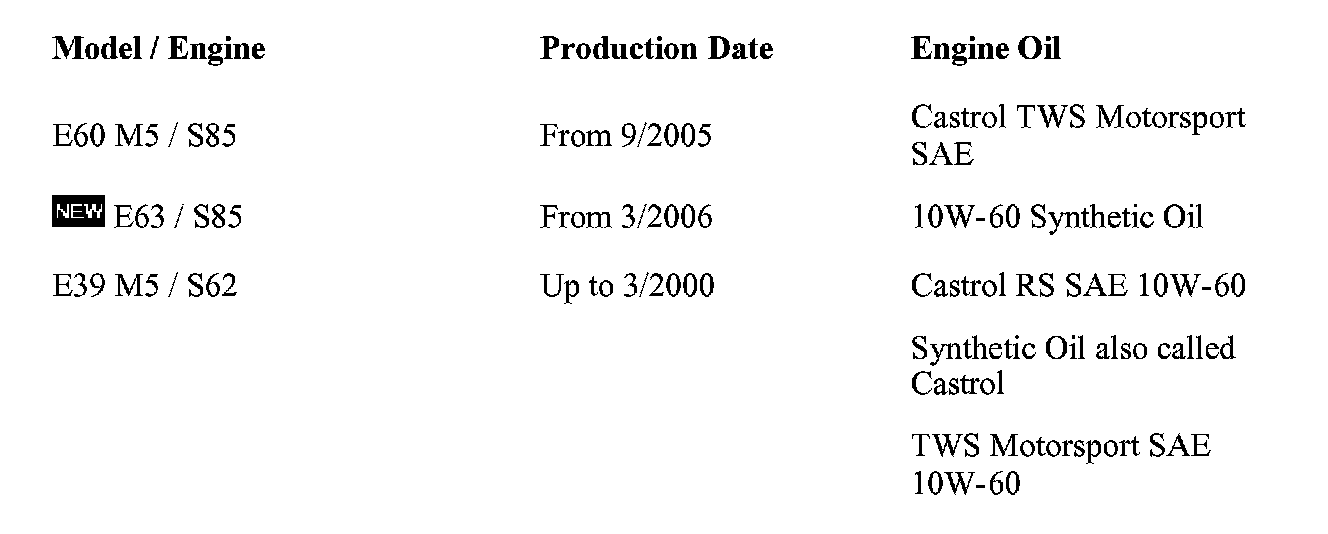 ^ The M5 up to 3/00 production requires a specially formulated synthetic engine oil - Castrol Formula RS SAE 10W-60 or Castrol TWS Motorsport SAE 10W-60 and is the only approved oil for this engine.