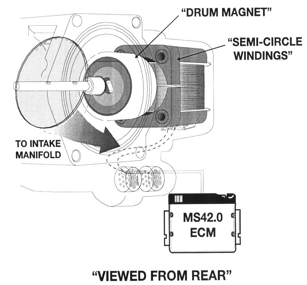 The throttle motor is controlled by the MS42.0 ECM. The ECM will actuate the MDK motor by pulse width modulation (12 V supply) in both the opening and closing direction (at 600 Hz base frequency) to position the throttle plate. The motor is unitized in the MDK housing and is not serviceable.