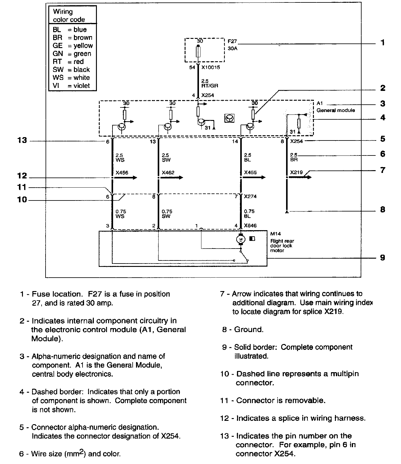 A sample wiring diagram is shown below. It identifies many of the elements found in the diagrams within this section. Note that a dashed line indicates that only a partial view is given and more information on that component or circuit can be found elsewhere in the schematics.