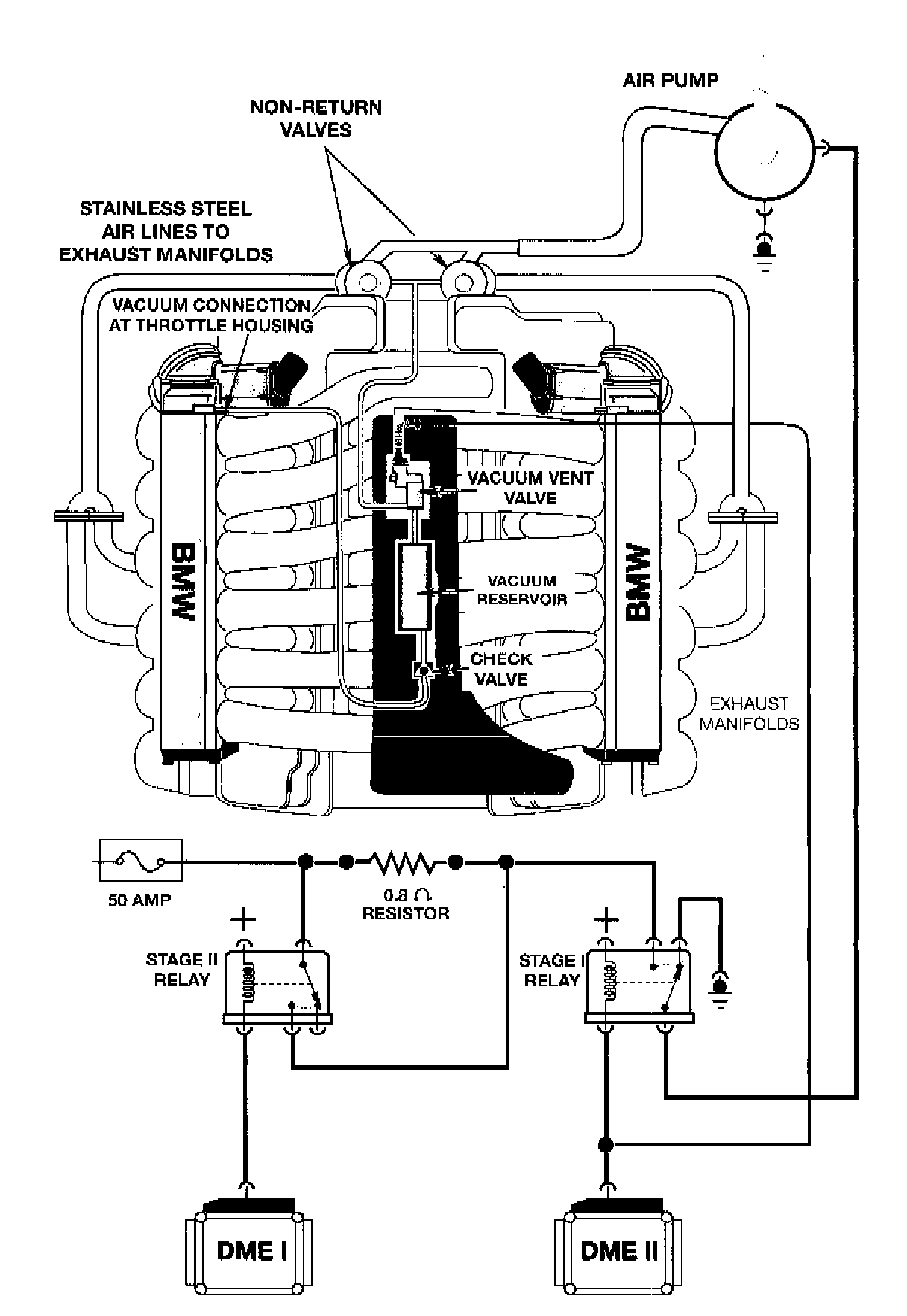 The secondary air injection system is controlled by both Engine Control Modules to provide two pump speeds. After engine start-up DME II simultaneously switches the stage I relay control circuit to ground and activates the secondary air vacuum vent valve allowing engine vacuum to open the non-return valves.