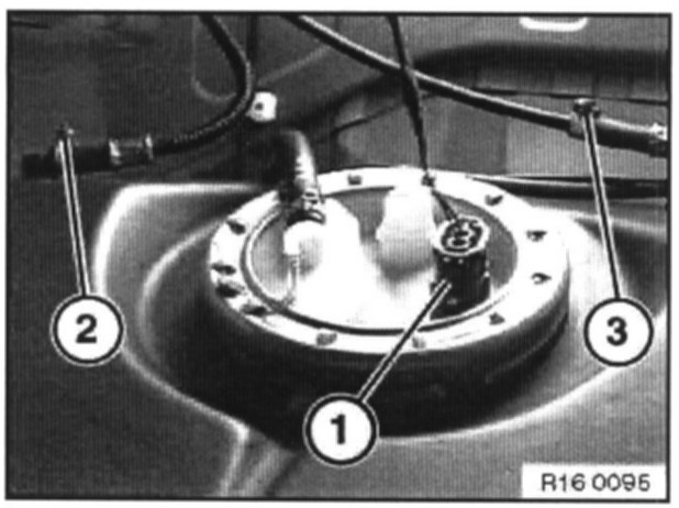Left half of tank, Re move connector (1) from fuel level sensor, unfasten hose clips (2/3) and remove tank vent lines.