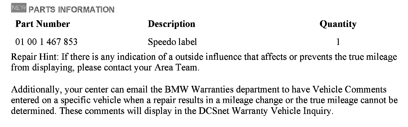 If it becomes necessary to replace an odometer, coding plug, light module or instrument cluster (resulting in the new odometer reading being reset to zero miles), a "non-removable" label is available from BMW NA to record the previous mileage.