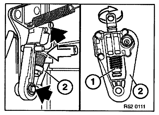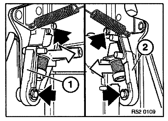 Remove backrest adjustment gearing (1) and drive unit for head restraint adjustment (2).