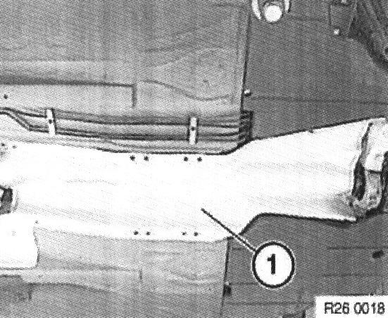 Bend propeller shaft downwards at center mount (1), detach from transmission output flange and tie back to one side on underbody of vehicle.