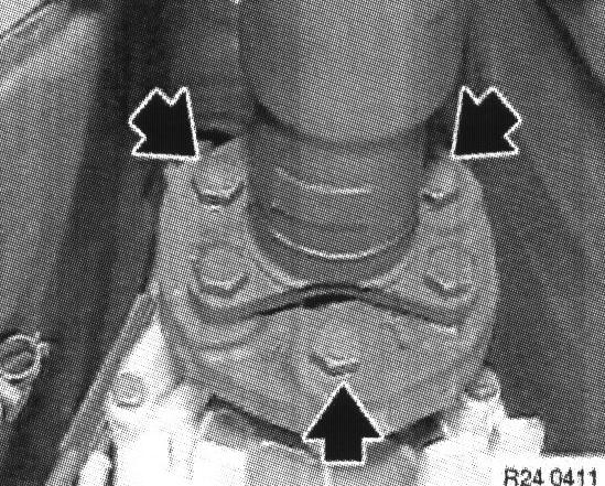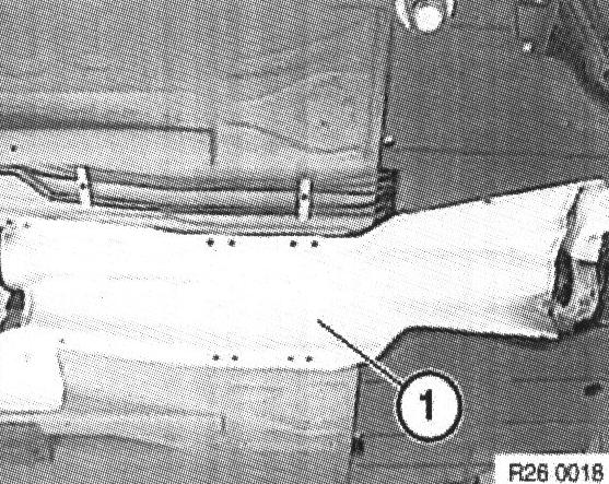 Bend propeller shaft downwards at center mount (1), detach from transmission output flange and tie back to one side on underbody of vehicle.