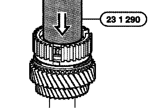Insert 5th gear synchronizer ring into the sliding sleeve. Pull the operating sleeve upwards uniformly as far as the lock (neutral position).