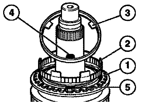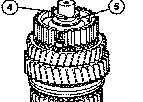Install synchromesh ring (1), intermediate ring (2), and inner race (3) with dogs (4) in openings (5) of the guide sleeve.