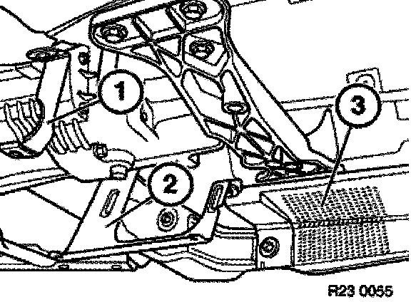 Remove bracket for transmission underbody protection (1 - 2) and heat shield (3).