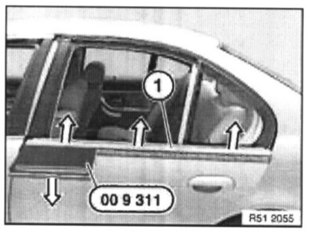 Using special tool 00 9 311 (beginning at front proceeding to rear), lever out window cavity cover strip (1).