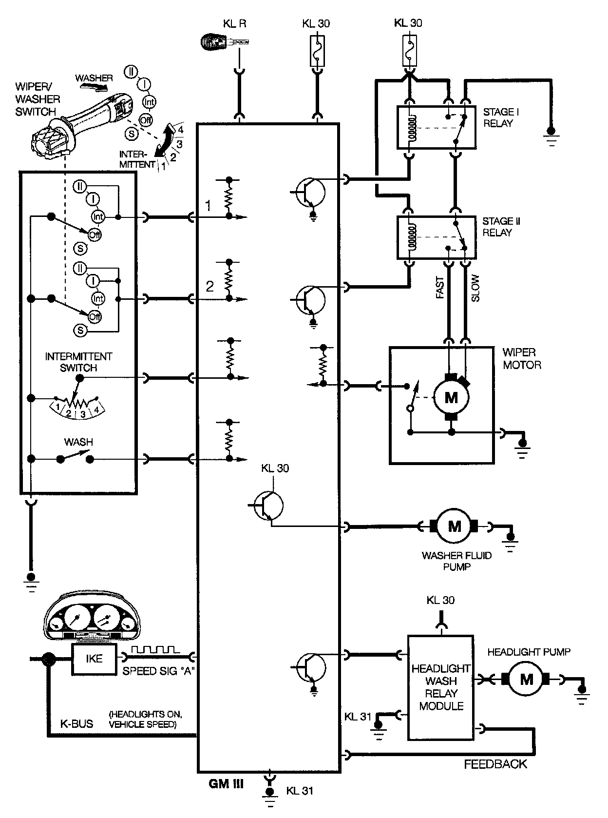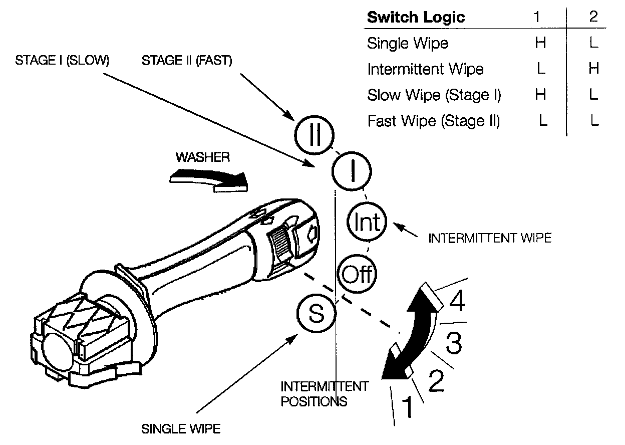 The functions of single wipe, intermittent wipe, slow and fast wipe are coded input signals to the GM III through two circuits. The GM recognizes from the combination of high/low signals which wiping function to activate.