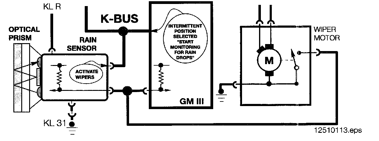 - As an acknowledgement, the rain sensor sends a command via the K Bus to activate the wiper motor. If more than 12 seconds pass before the GM receives them acknowledgement, the GM concludes the rain sensor has a defect and operates the intermittent wipe function as a system not equipped with a rain sensor. The wiper intermittent cycling is based solely on the knurled wheel setting.