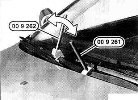 If the approach angle is incorrect, joint on right wiper arm must be braced with special tool 00 9 261 and rotated into the correct position using special tool 00 9 262.