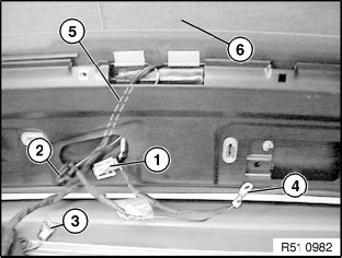 Withdraw connector (1 ... 4) from rear window frame (5) and secure to rear window with adhesive tape (6).
