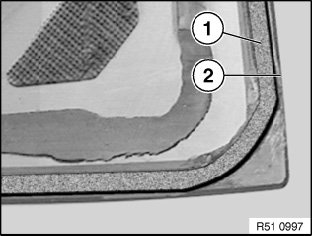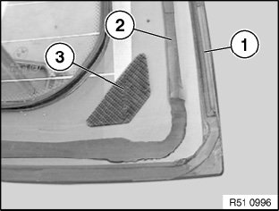 Cut away residue of external seal (1) and cement bead (2) on the rear window to a thickness of approx. 0.5 mm.