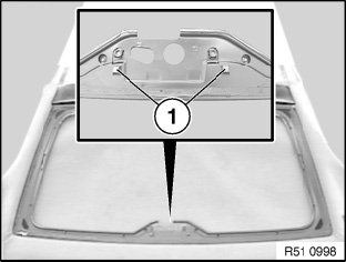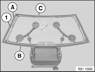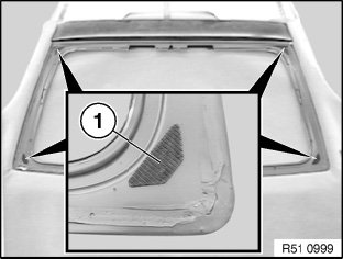 Install rear window with special tool 51 3 010, centre and insert edges (1) in the burr tapes (Dual-Lock tape).