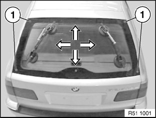 Attach special tool 51 3 010 to rear window (as far outside as possible) (dampen the suction surfaces).