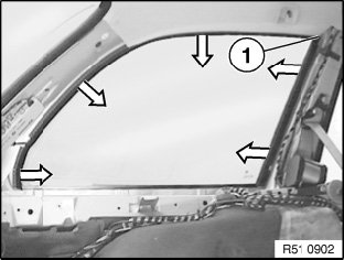 CAUTION: Remove dirt from residual cement with Sika-Entferner 208 (Sourcing Reference: BMW Parts Service) before cement is hard. Do not press side window back out. Hardened cement can only be removed by machine.