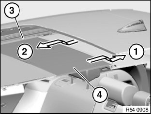 Tension top seat belt tensioner (3) until eye can be pulled approx. 20 mm toward rear (4).