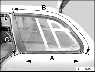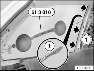 Applying slight preload (2nd person pulling on special tool 51 3 010 attached to move rear side window outwards), carefully cut away cement bead with scalpel cement around the C pillar.