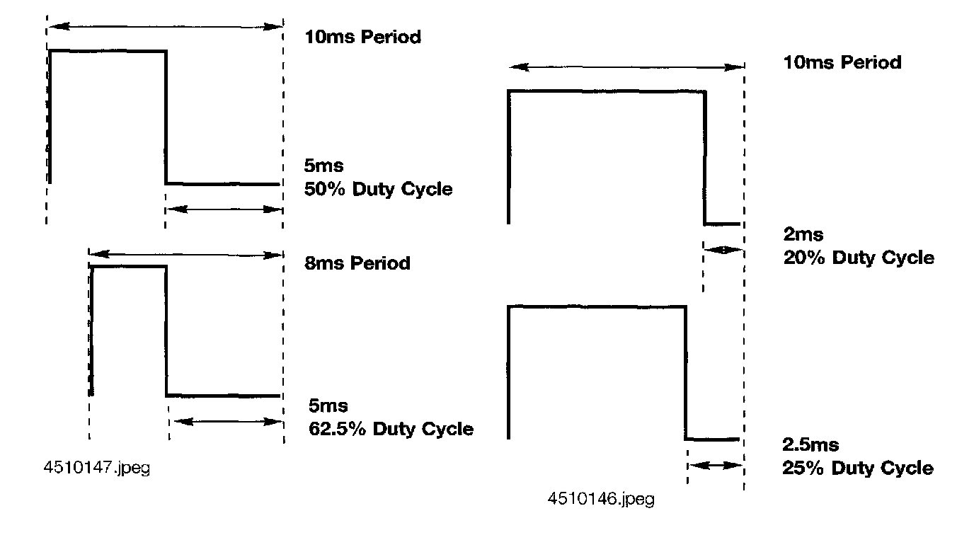 The Duty Cycle of a square wave is the ratio of ON time to OFF time for one cycle. Duty cycle is expressed in %. Vehicle systems use both fixed duty cycle signals and variable duty cycle signals.
