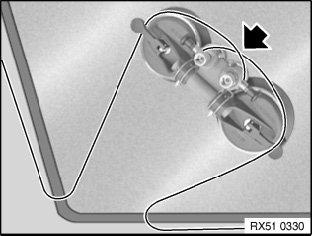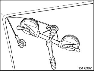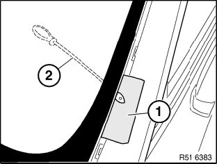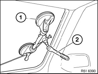 - To avoid damage and if necessary dirt, protect A-pillars, roof and instrument panel by means of parabolic tool (1) or plastic washer (2)