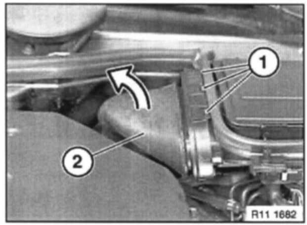 Carefully twist air duct (2) upwards until it is no longer locked in firewall. Pull air duct (2) forwards and remove towards top.