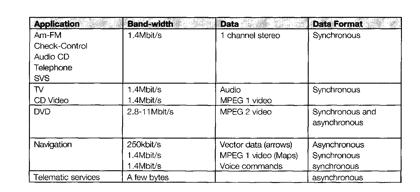 Different data formats also have different requirements for transmission regarding both mechanism (synchronous or asynchronous data) and the required band-width (baud or bits/second). The MOST format is able to meet these requirements to a satisfactory extent.