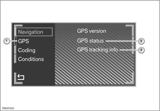 The sensory check of the navigation system takes place using a hidden menu on the Control Display (CD). The display of internal data and signals on the Control Display enables a check of the navigation system during a test drive.