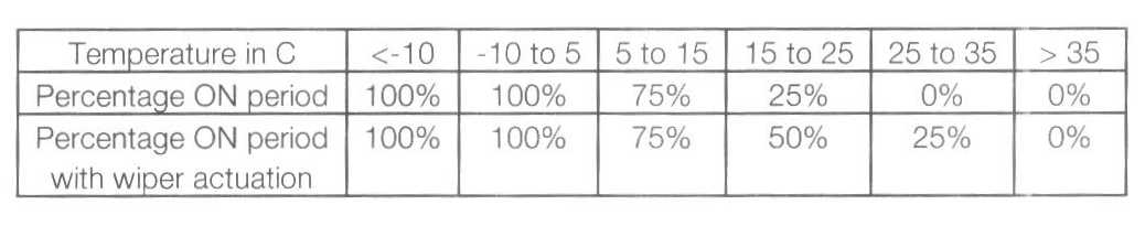 When the wiper is deactivated, the higher percentage ON period remains active for a further 5 minutes. The mirror heating is operational from terminal 15 "on". It is deactivated with terminal 50 "on"(load deactivation during the starting sequence).
