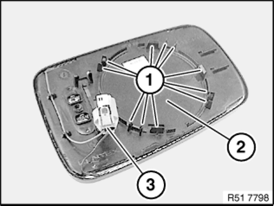 Unlock and disconnect associated plug connections, remove mirror glass (1).