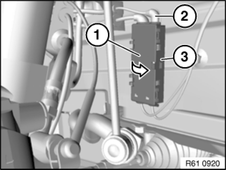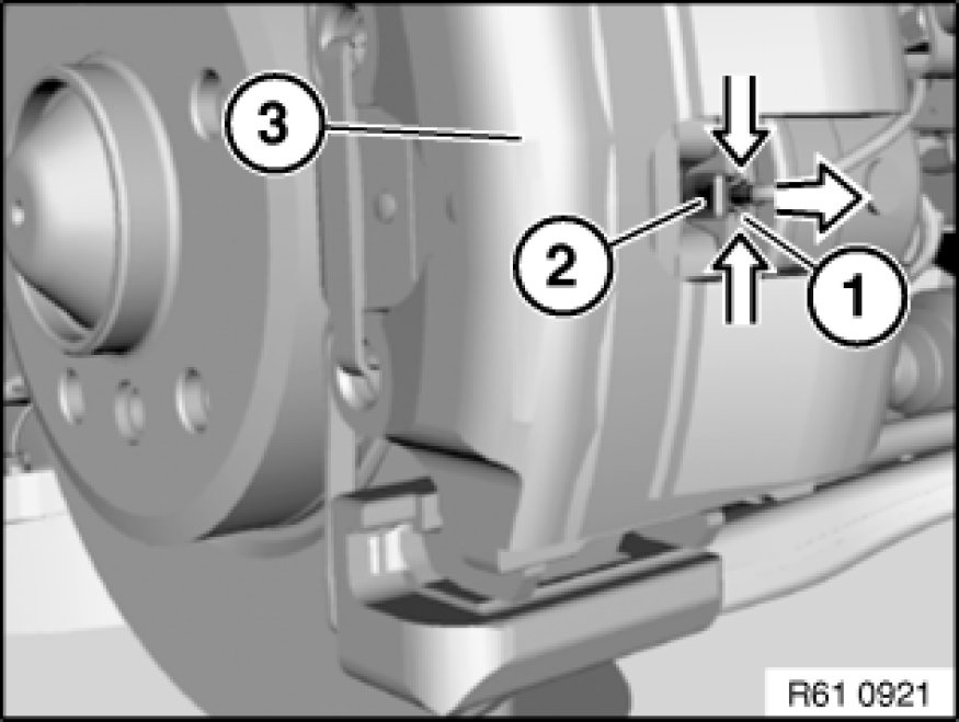 Press clip (1) together and detach brake pad sensor (2) in direction of arrow from brake pad (3).