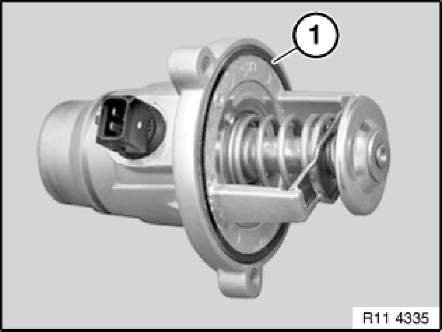 Coolant thermostat is integrated in cover and can only be replaced as a complete unit.