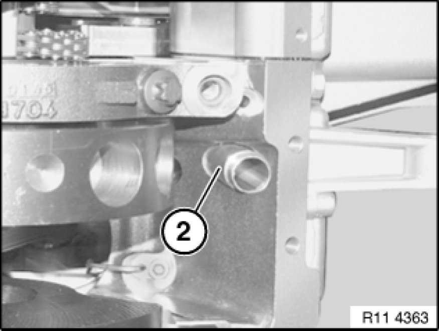 Insert oil line (2) in bore hole in oil pump.