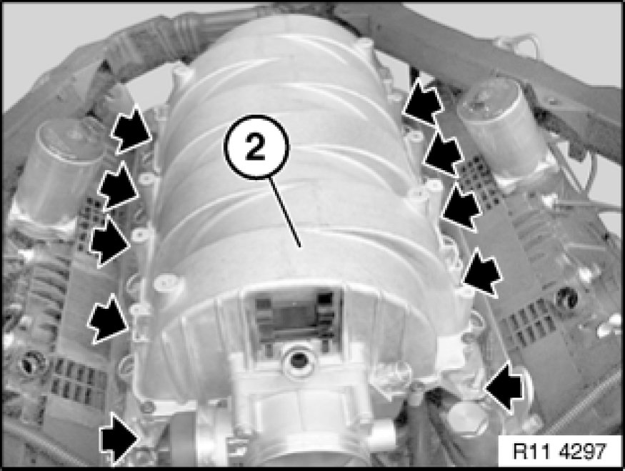 Remove intake air manifold (2) upwards with aid of a second person.
