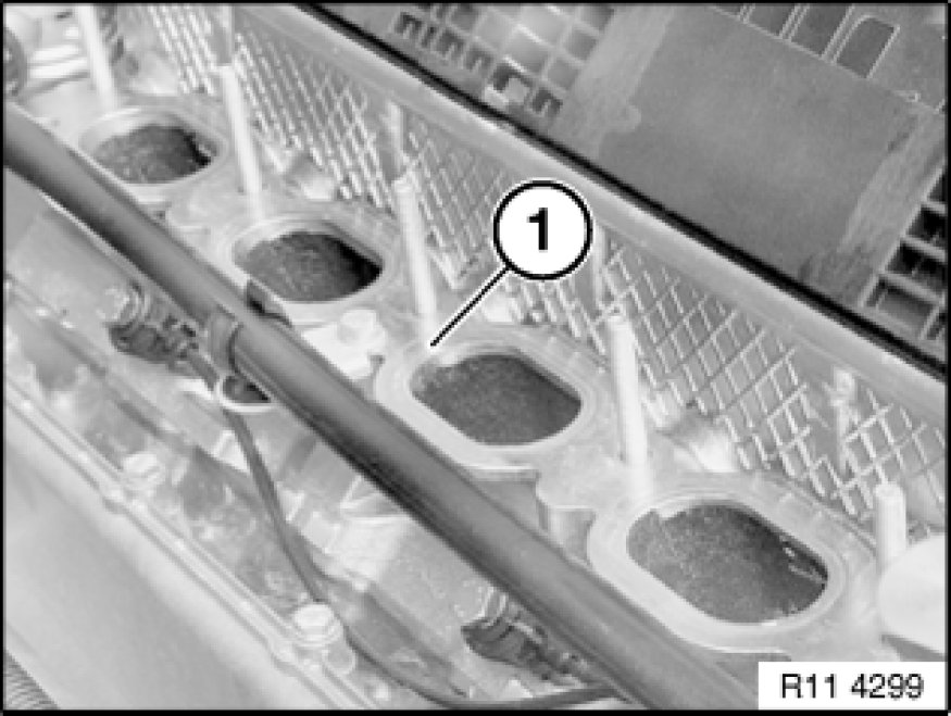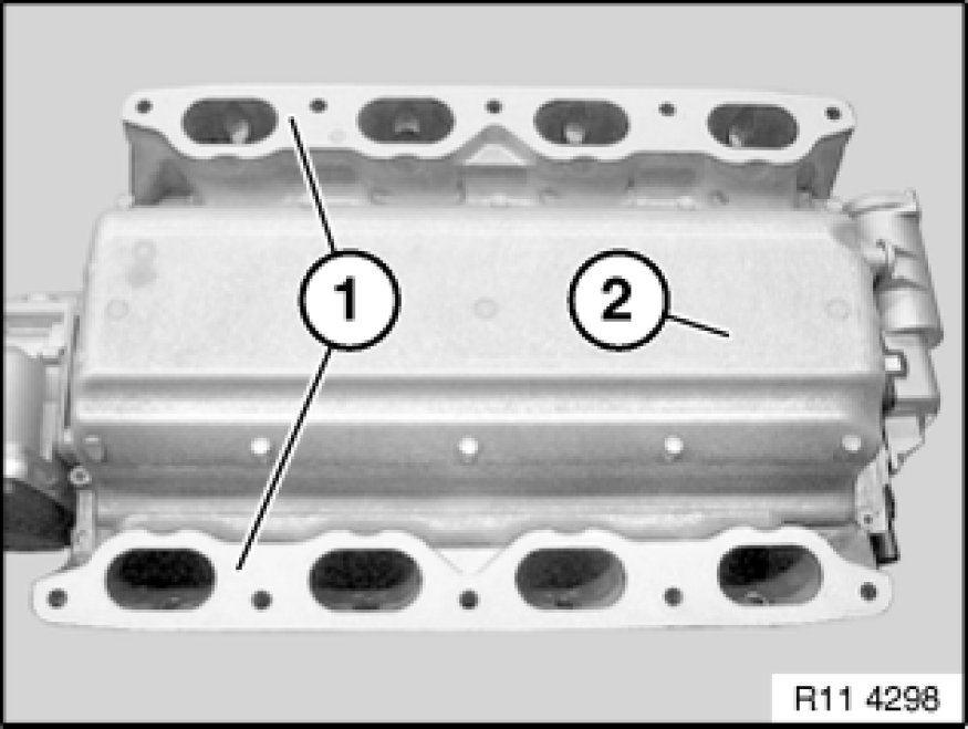 Clean sealing faces (1) on intake air manifold (2).