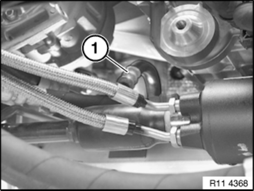 Unlock and detach hydraulic line (1).