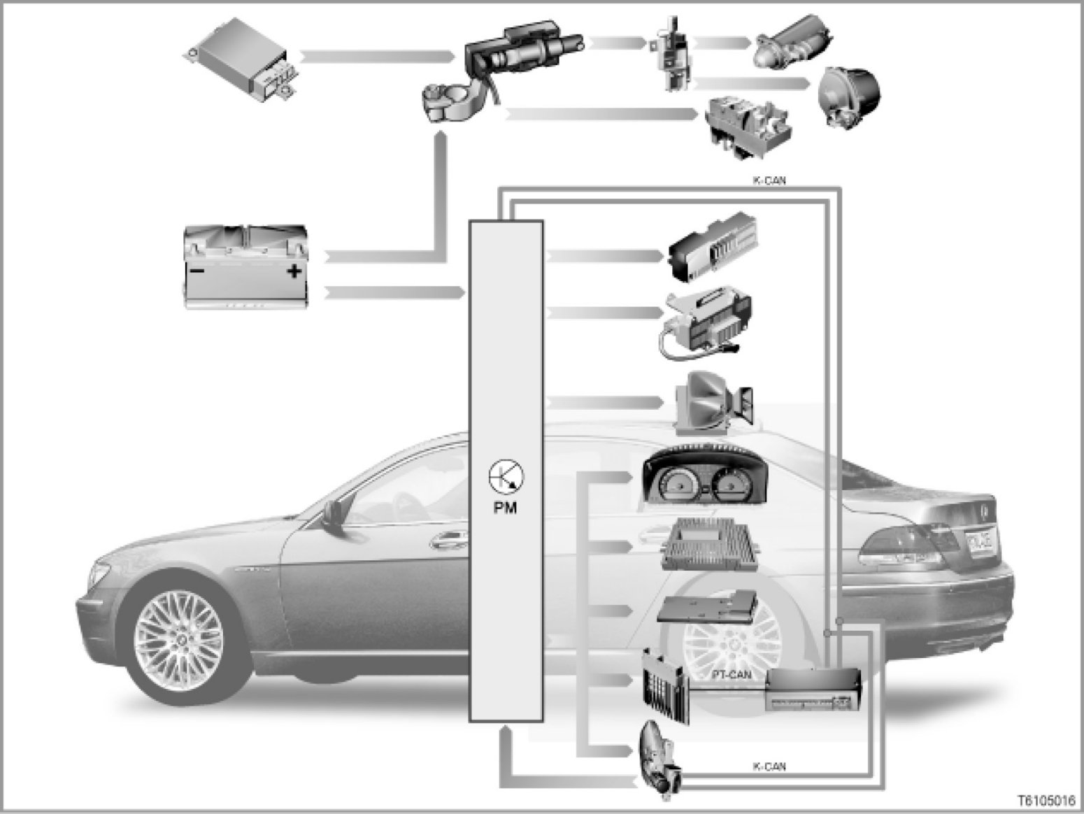 A new feature is that terminal 30LM is now also switched by the power module. However, current measurement is not possible at terminal 30LM. Increased off-load current consumption is indirectly detected by the monitoring of bus communications on the K-CAN. (K-CAN = "body controller area network.)