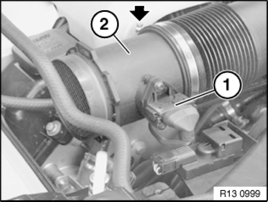 Check sealing ring between air-mass flow sensor (2) and intake hose for damage; replace if necessary.