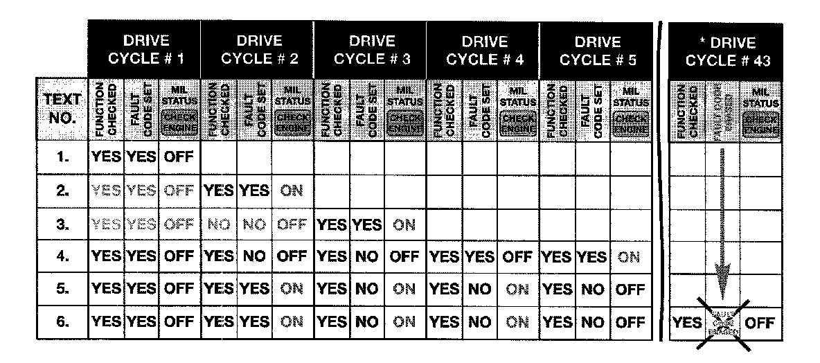 3. If the second drive cycle was not complete and the specific function was not checked as shown in the example, the ECM counts the third drive cycle as the "next consecutive" drive cycle. The "Malfunction Indicator Light" is illuminated if the function is checked and the fault is still present.