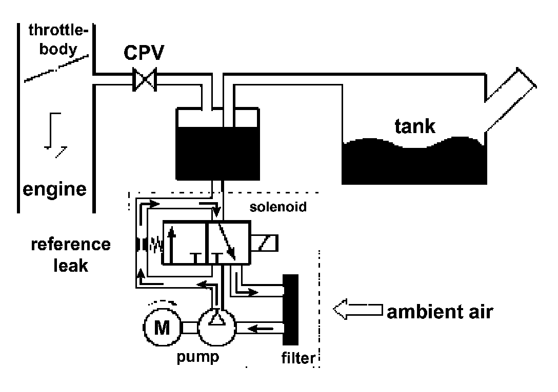 c) After the test the remaining pressure in the evaporative system is bled off through the charcoal canister by switching off the pump and solenoid.