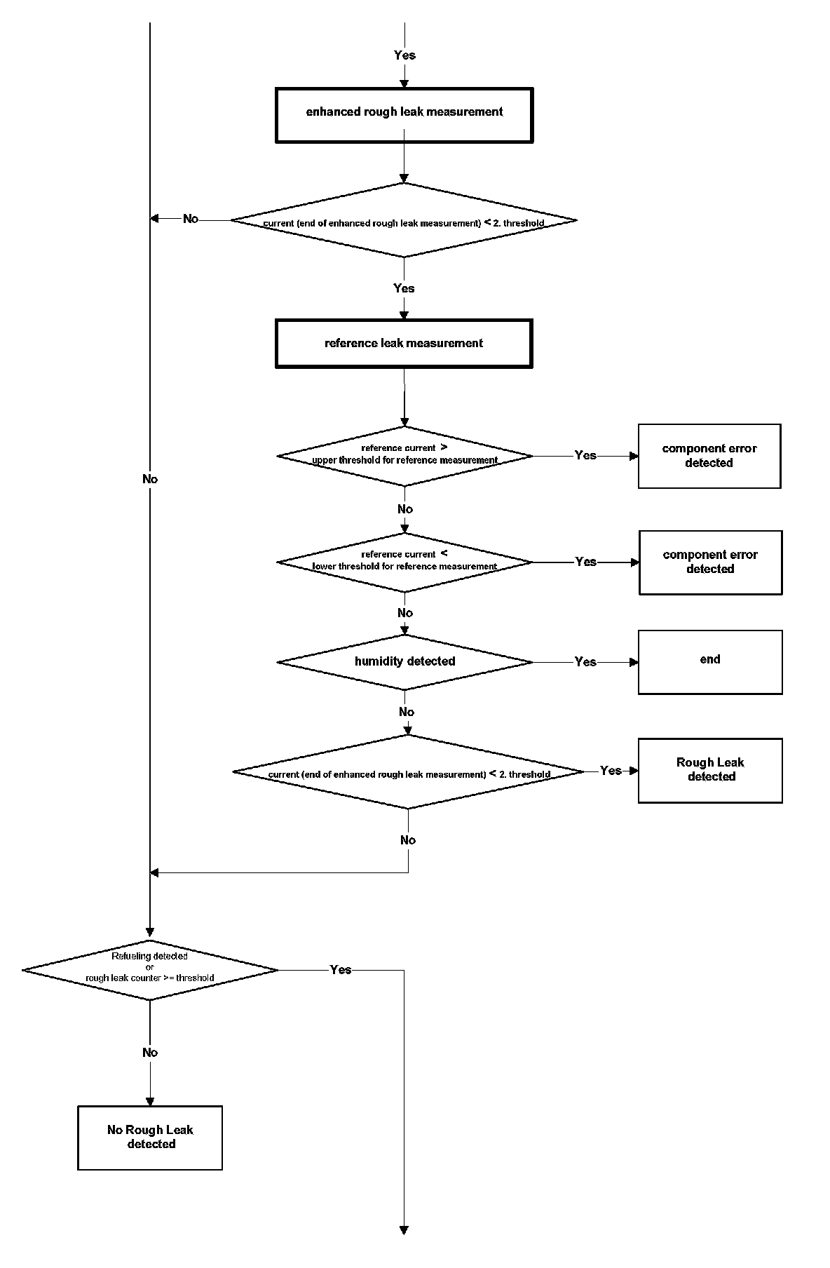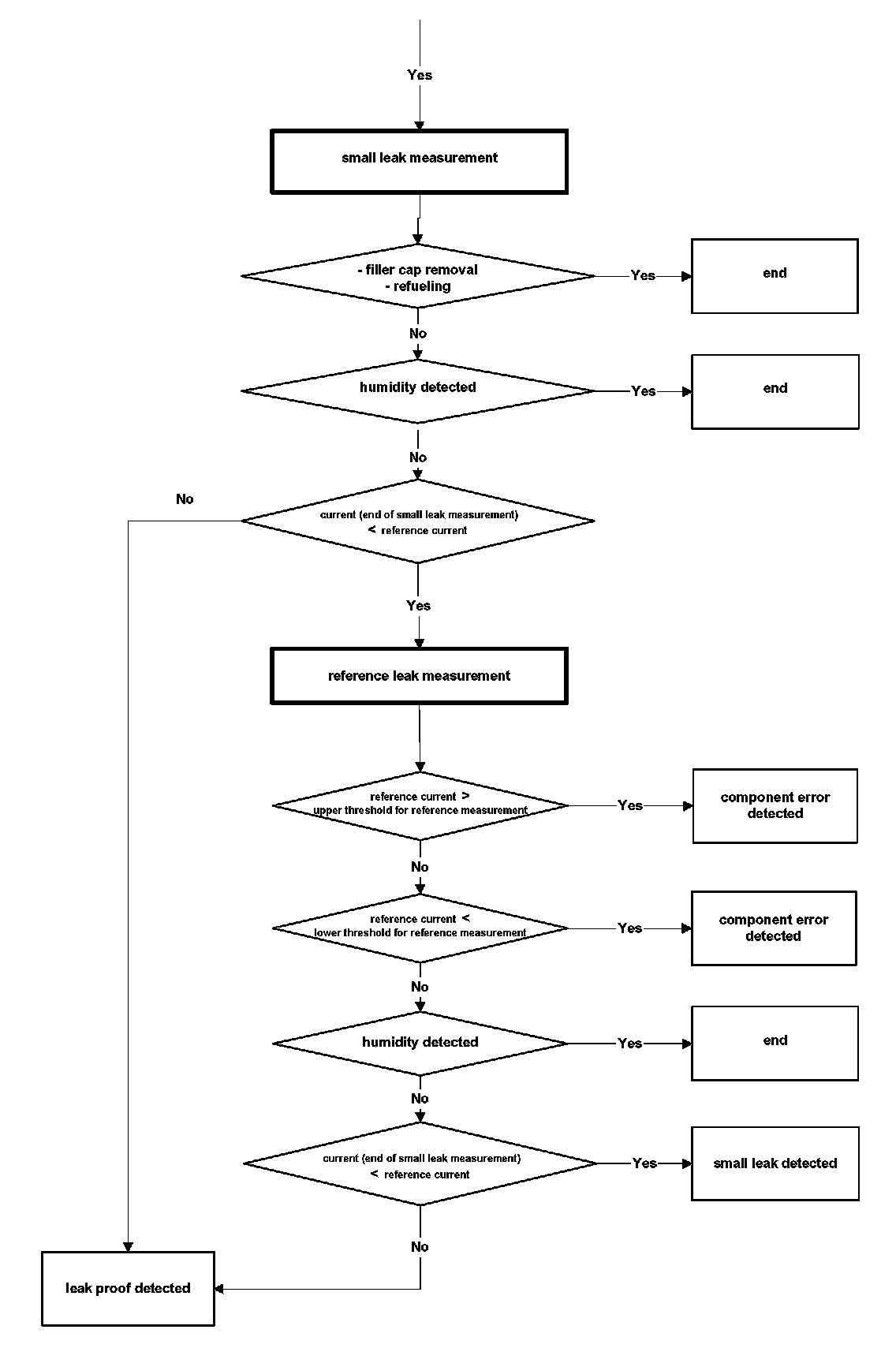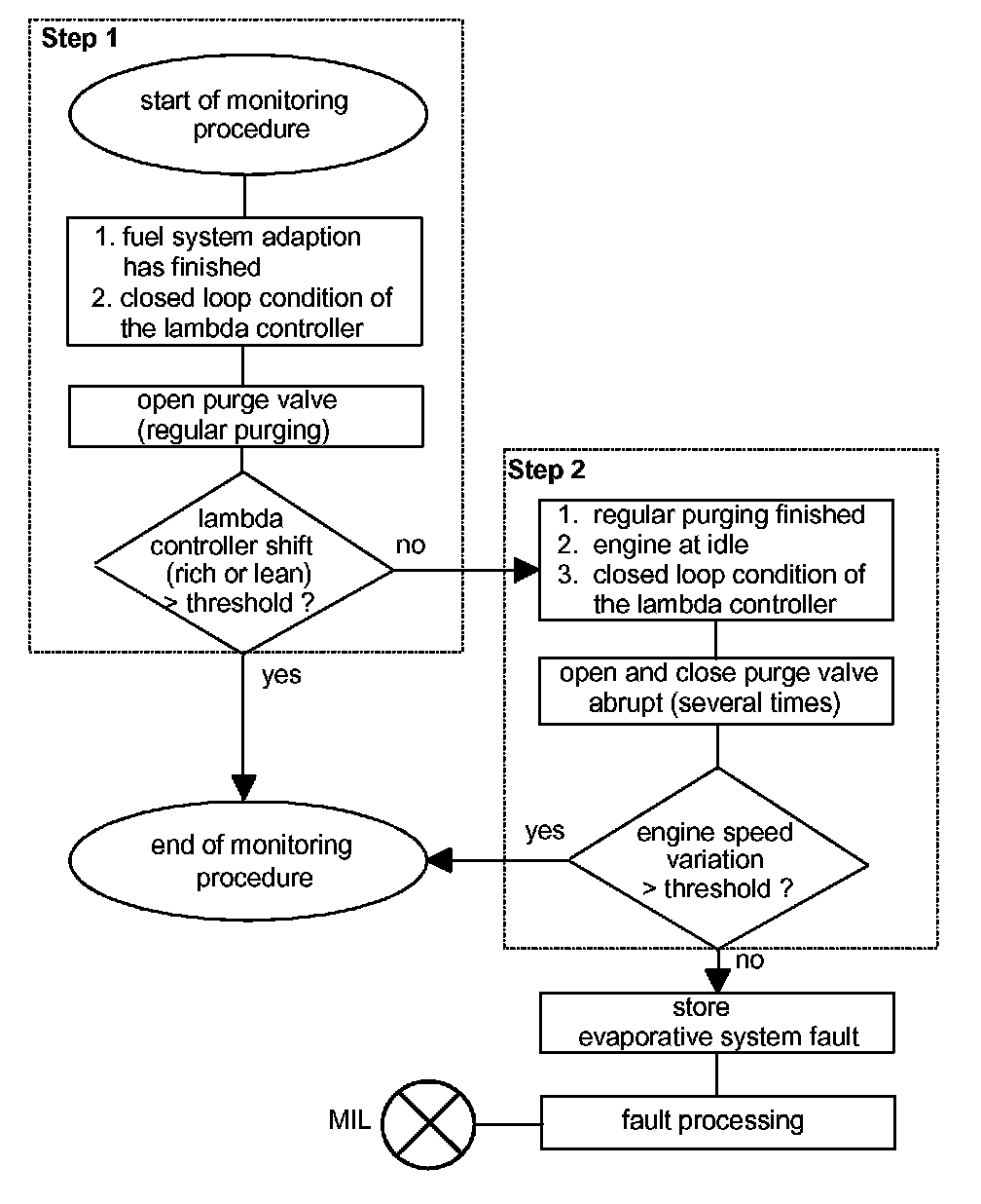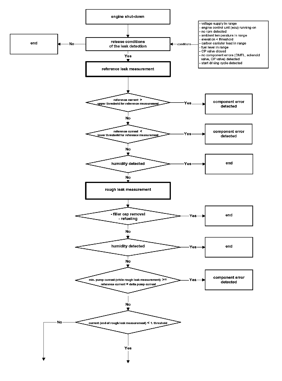 The purge flow from the charcoal canister through the purge valve is monitored after fuel system adaptation is completed and the lambda controller is at closed loop condition. The diagnosis is started during regular purging.