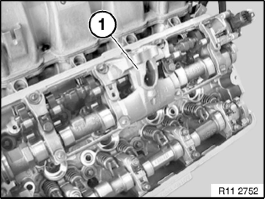 Place bearing bracket (1) with inlet camshaft and eccentric shaft as illustrated on special tool 11 9 470 11 9 470 Support.