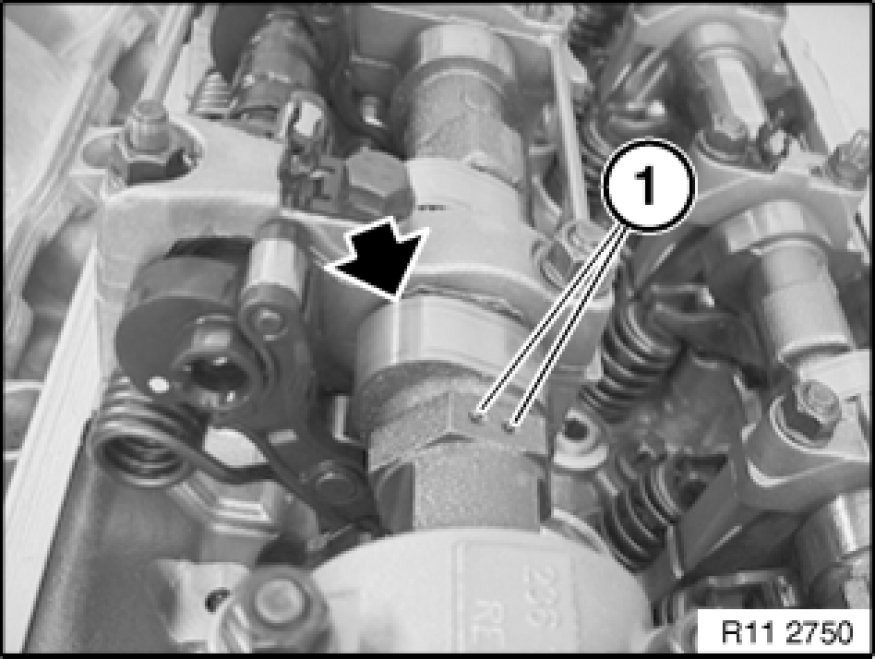 The marking (1) on the hexagon drive of the inlet camshaft faces upwards.