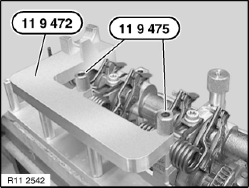 Special tools 11 9 472 11 9 470 Support and 11 9 475 11 9 470 Support prevent the inlet camshaft from rotating and moving while the intermediate levers are installed.