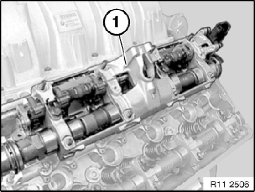 Place bearing bracket (1) with inlet camshaft and eccentric shaft as illustrated on special tool 11 9 470 11 9 470 Support.