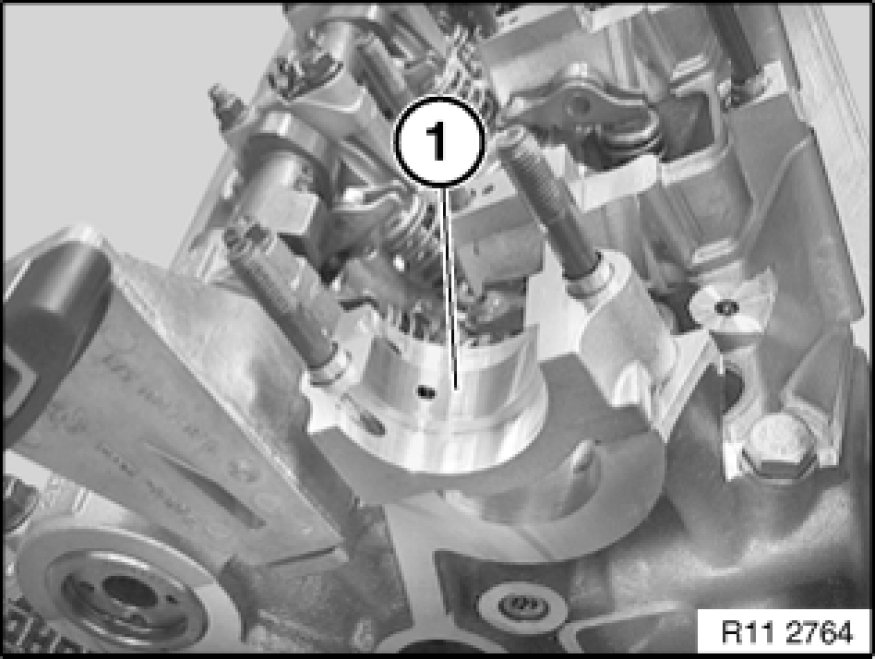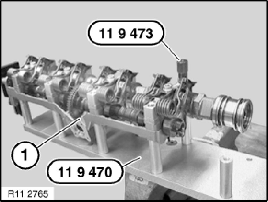 Place bearing bracket (1) with inlet camshaft and eccentric shaft as illustrated on special tool 11 9 470 11 9 470 Support.