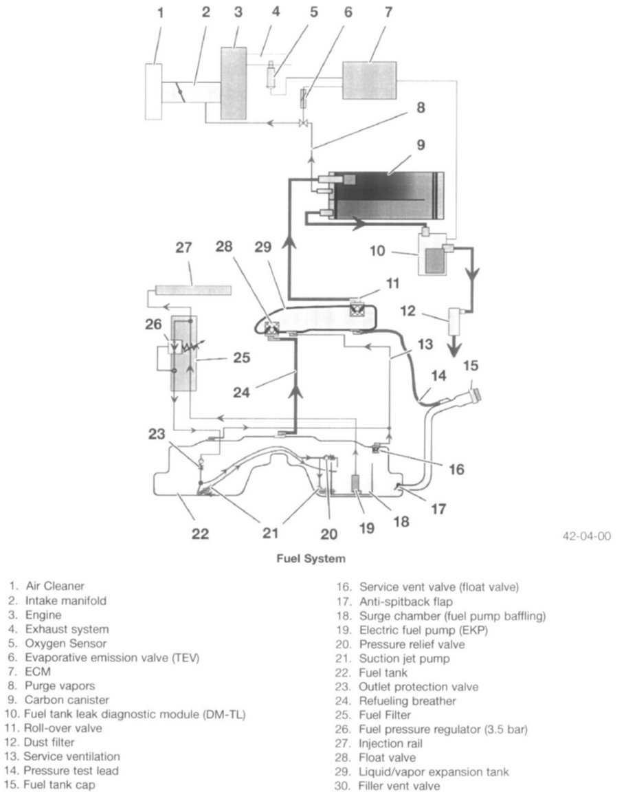 When refueling, the pressure of the fuel entering the tank forces the hydrocarbon vapors through the tank refuelling breather hose to the liquid/vapor expansion tank and into the active charcoal canister.