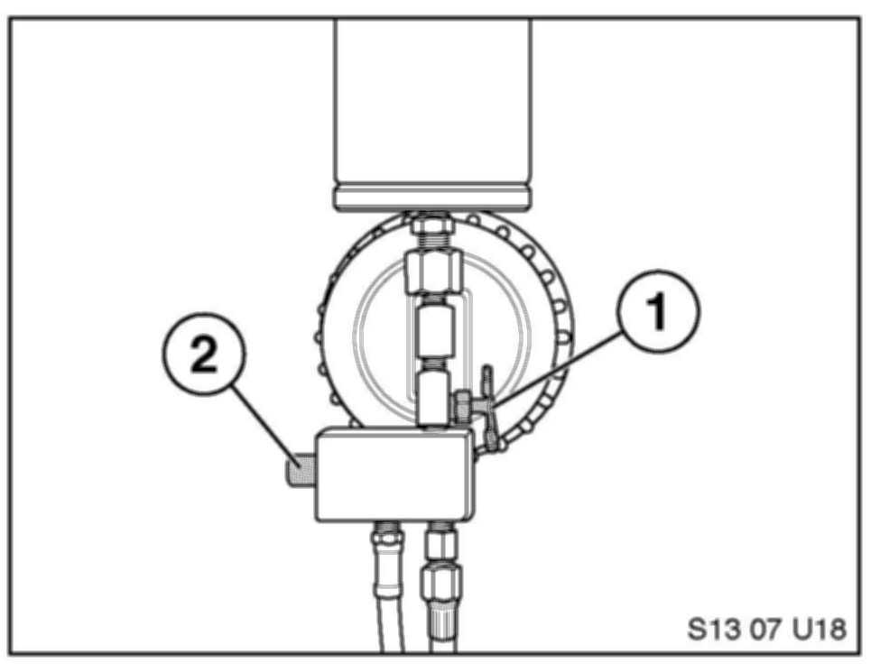 26. Release the pressure from the applicator cylinder with the pressure release button (2). Close the shutoff valve (1).